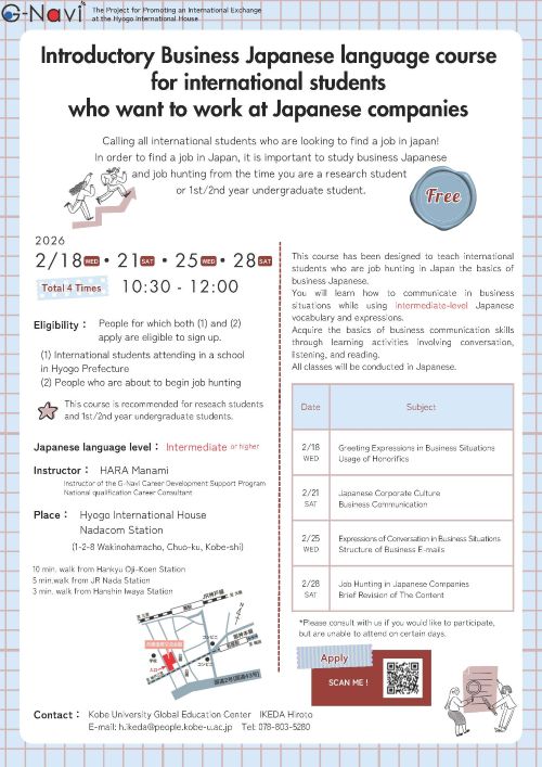 | 対象 | ①②の両方にあてはまる人 ① 兵庫県にある大学の留学生 ② これから就職活動をする人 研究生、学部1・2年生におすすめです。 |